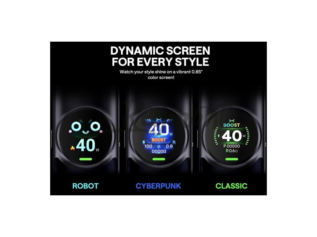 Součástí zařízení je velkokapacitní 4ml cartridge, která umožňuje více než 15 naplnění a disponuje 5vrstvou ochranou proti úniku, což zaručuje spolehlivý a čistý provoz. Přehledný 0,85" barevný displej poskytuje snadný přístup ke všem nastavením zařízení a zobrazuje důležité informace. Integrovaná 1500mAh baterie s rychlým nabíjením 5V/2A zajišťuje dlouhou výdrž a rychlé doplnění energie. Kromě toho zařízení umožňuje nastavení výkonu v rozmezí 5–40 W, díky čemuž si každý uživatel může přizpůsobit zážitek z vapování podle svých preferencí.